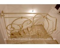 Wir fertigten dem Kunden eine Zeichnung der Harfe an und ihm gefiel unsere außergewöhnliche Idee mit runden Formen. Auf der Wandseite wurde zusätzlich ein normaler Handlauf aus Schmiedeeisen angefertigt, der sich ebenfalls durch elegant geschwungene Formen an den Enden auszeichnet. Im Obergeschoss fertigten wir zusätzlich ein normales Treppengeländer im gleichen Stil an.